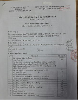 - Tên Công ty viết bằng tiếng Việt: CÔNG TY CỔ PHẦN NHỰA THÁI BÌNH DƯƠNG
